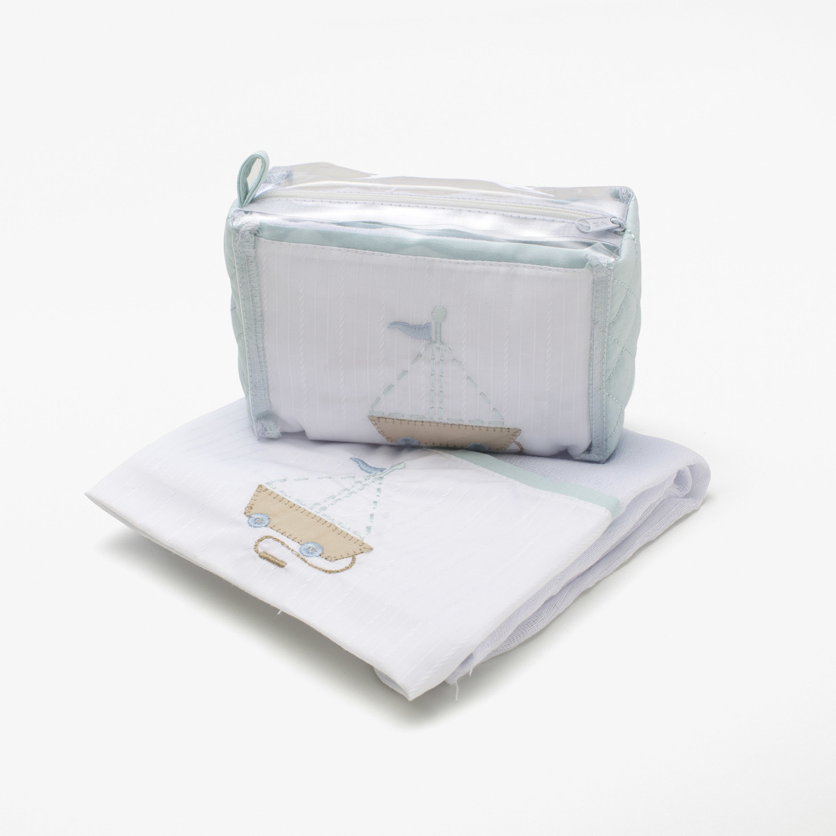 Necessaire com 2 fraldas de ombro. Necessaire transparente com detalhe em tecido de algodão com zíper. Medidas: Necessaire (LxCxA) : 15x5x10cm Fralda (LxC): 70x70cm cada Instruções de Lavagem: - Lavar à mão - Não alvejar - Não secar em tambor - Passar ferro até 150º - Limpeza a seco profissional com tetracloroetileno - Secagem à sombra Garantia: Defeito de Fabricação